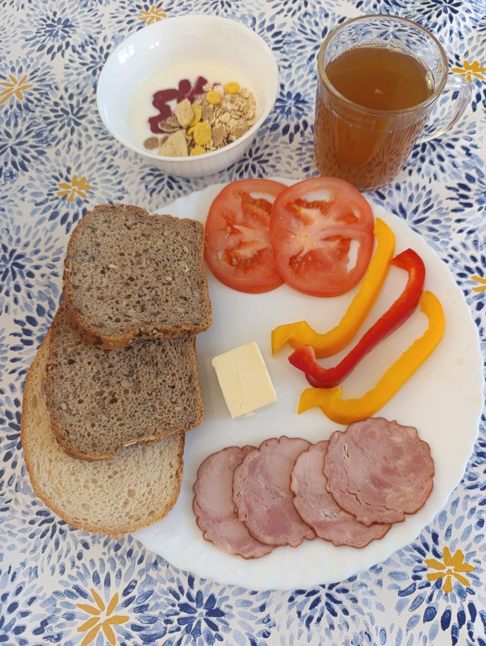 Chleb żytni bez drożdży 40g1+ pasta twarogowa z suszonymi pomidorami 20g7 (198kcal) 2- chleb pszenny1 ML- szynka drobiowa 15g1,6,9 + ogórek