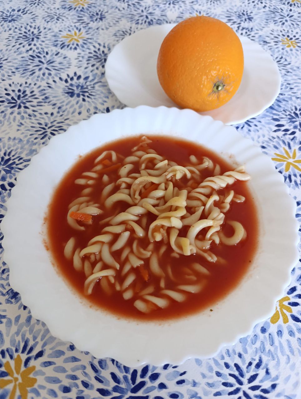 Pomidorowa zupa z makaronem 1,7,9  210ml /90g (180kcal) /ML. / 3./ 6.z makaronem pełnoziarnistym, zabielana śmietaną sojową8
