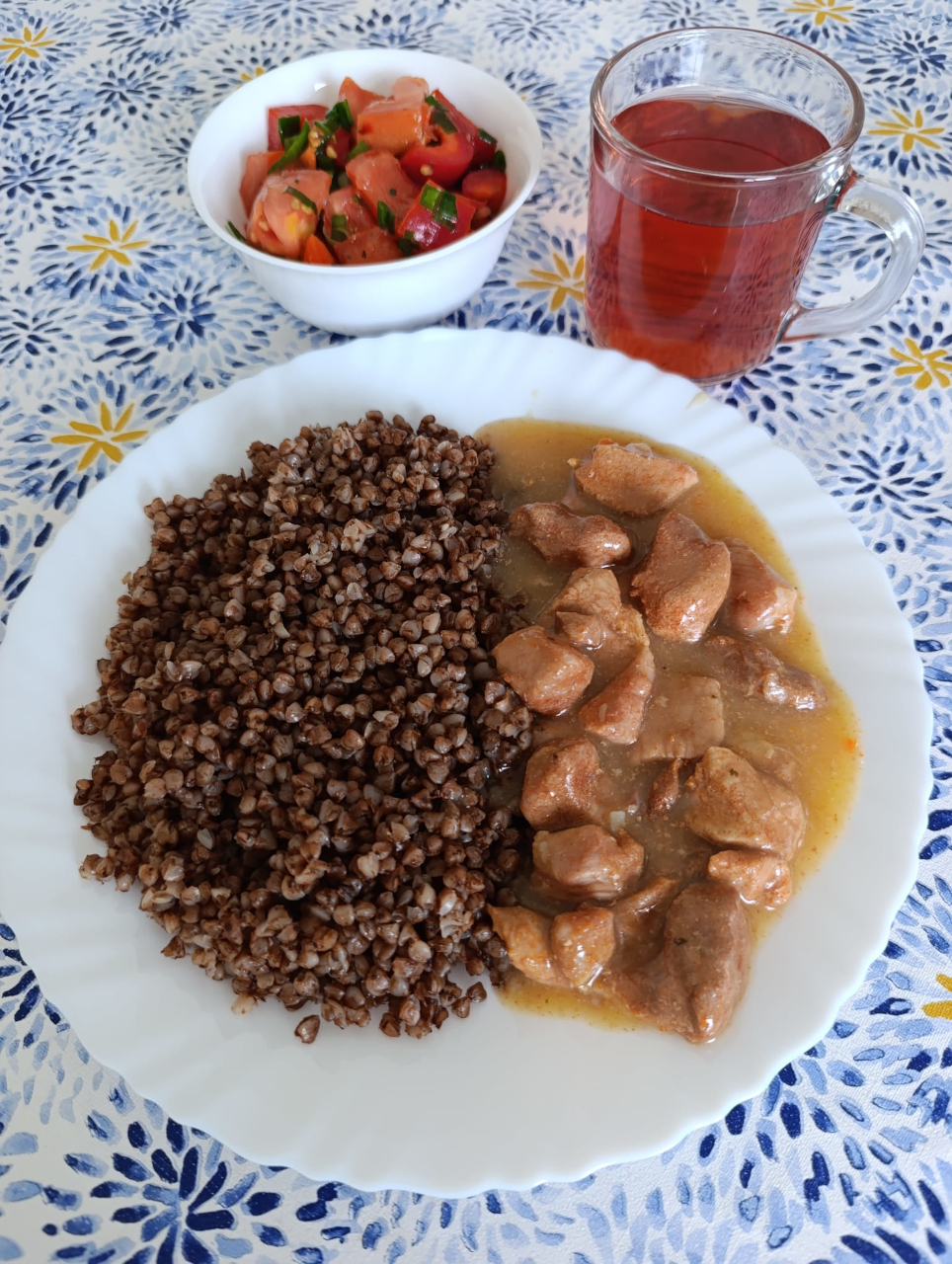 Pomidor z cebulką (40g/10g)(6kcal) /2./3. – pomidor bez skórki z koperkiem Herbata zielona z cukrem (250ml) (15 kcal) / 6./3. – bez cukru