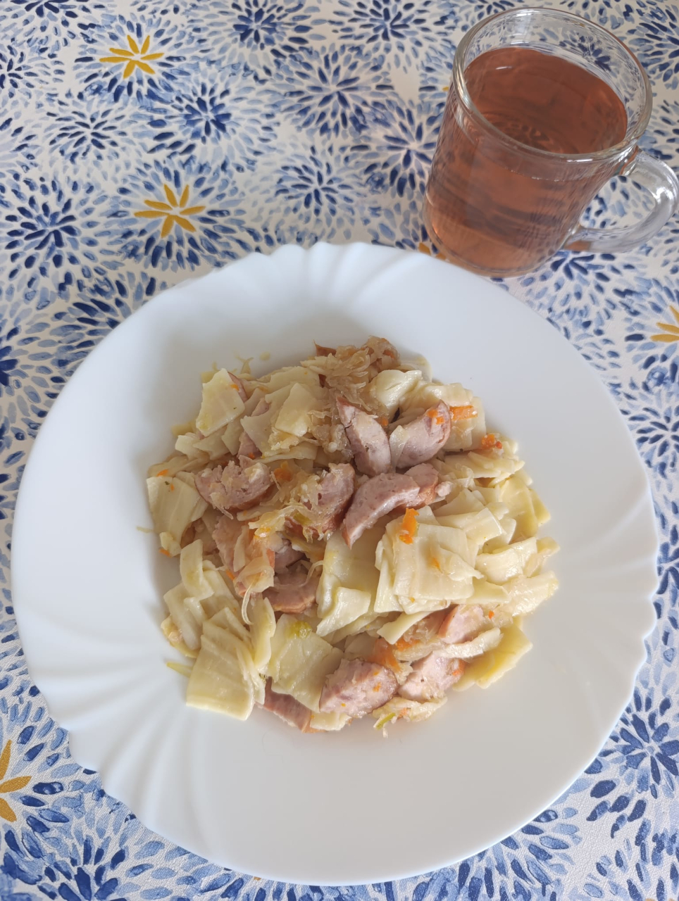 Łazanki z kapustą kiszoną i kiełbasą drobiową duszone350g(369kcal) /2./3. – Makaron w sosie