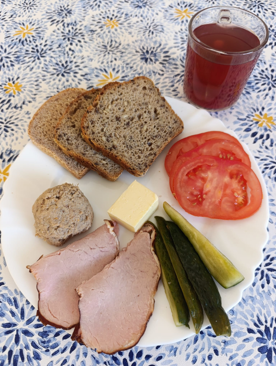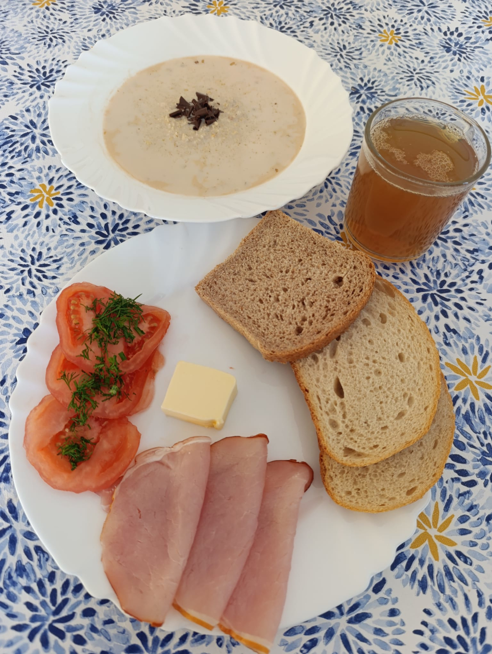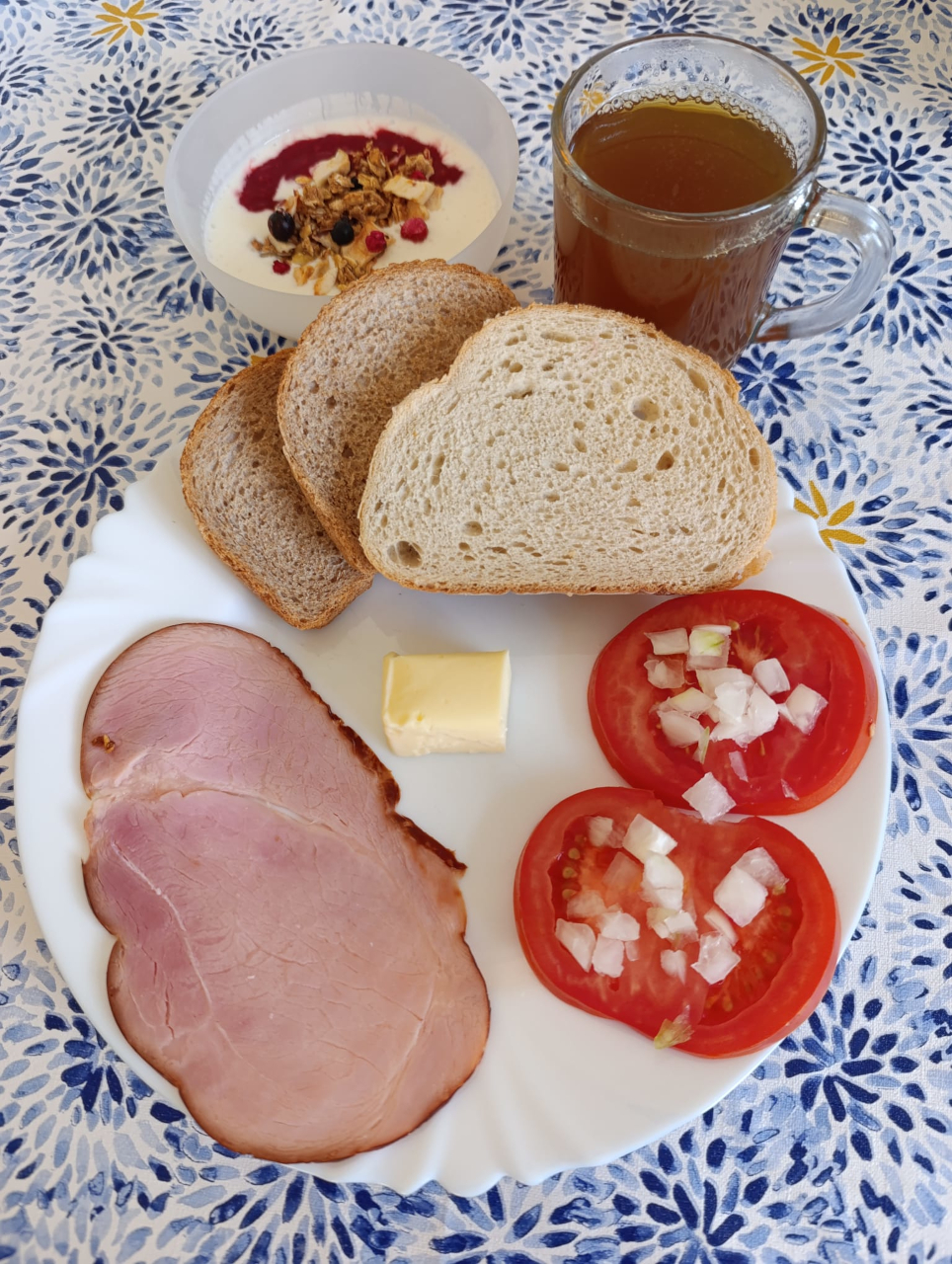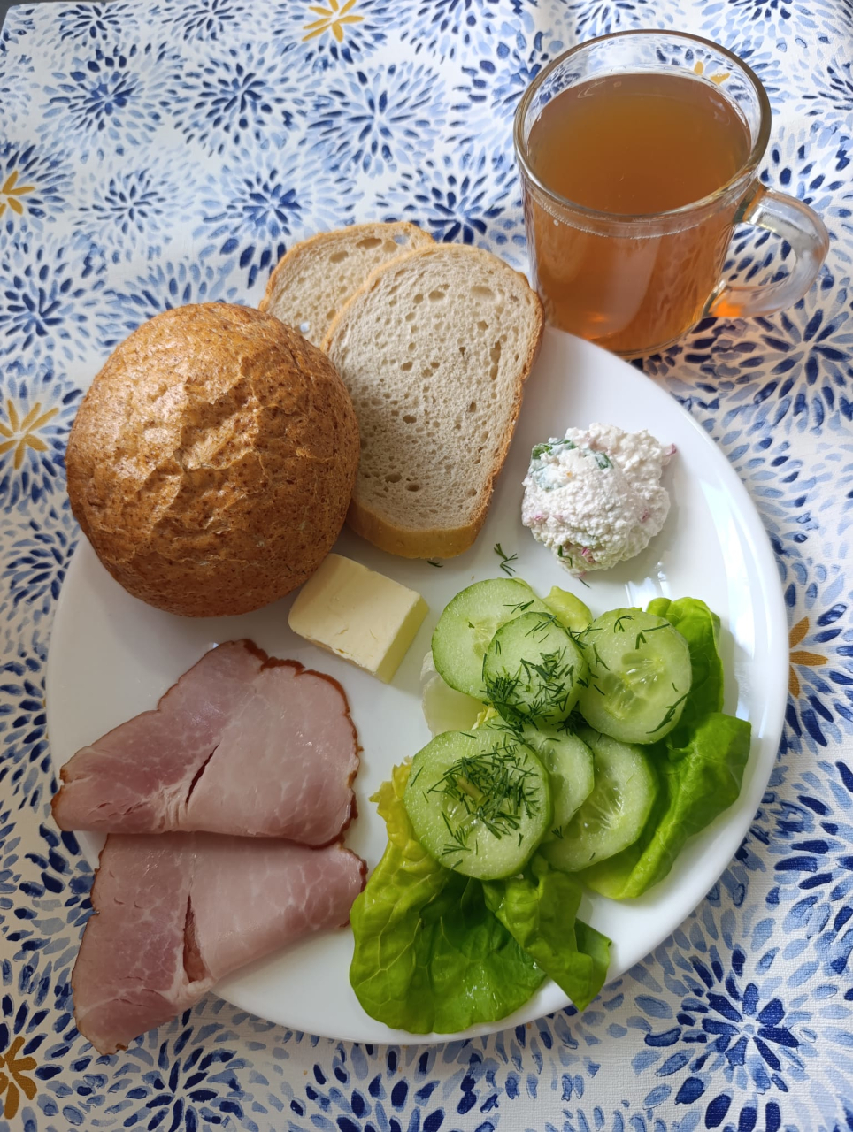 Szynka babuni1,6,9 (30g) (76kcal) /9. – szynka babuni 45g/ 3. – szynkówka drobiowa 30g Serek wiejski7 (100g) ze szczypiorkiem (5g)(105kcal) / ML. – jogurt sojowy6 zamiast serka wiejskiego /2./ 3. – bez szczypiorku