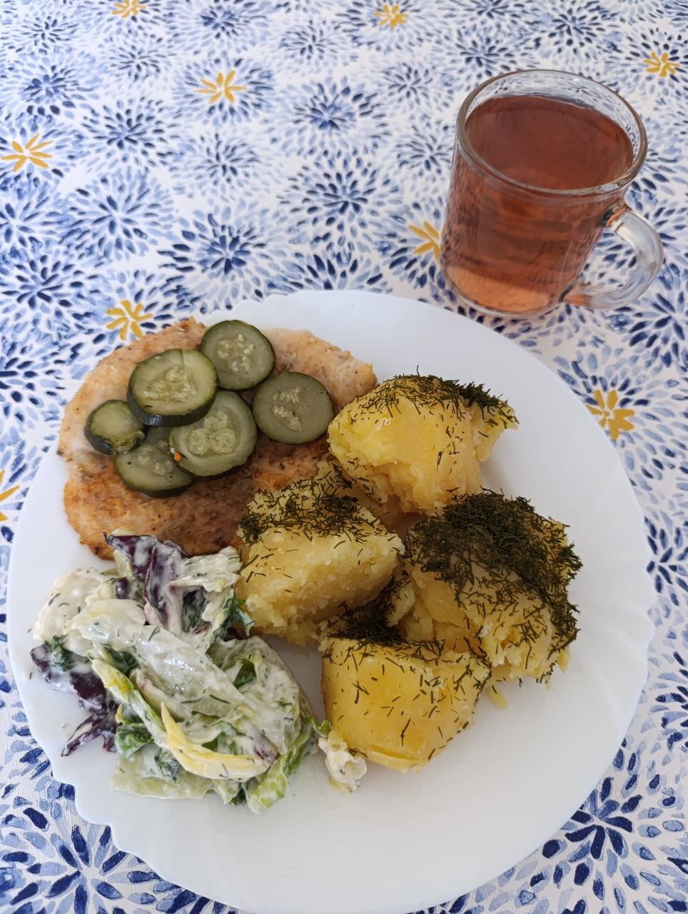 Ogórek małosolny na sałacie (40g/10g)(6kcal) /2./3. – pomidor bez skórki na sałacie 40g/10g Herbata z rumianku z cukrem (250ml) (15 kcal) / 6./3. – bez cukru