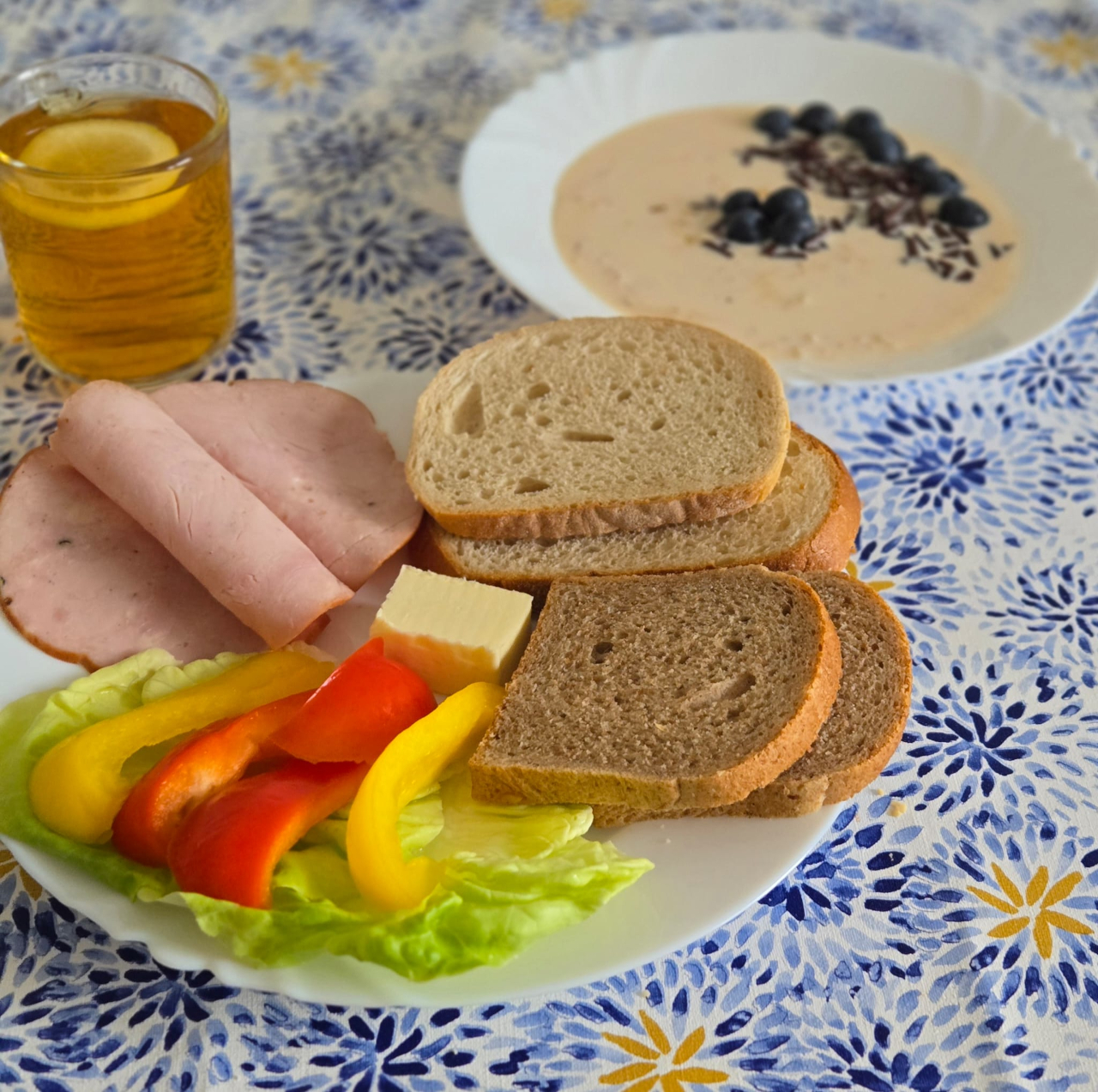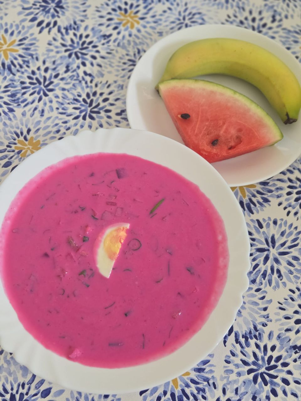 Chłodnik na kefirze z ¼ jajka3,7 300ml (102 kcal) /ML. – jogurt sojowy6 zamiast kefiru