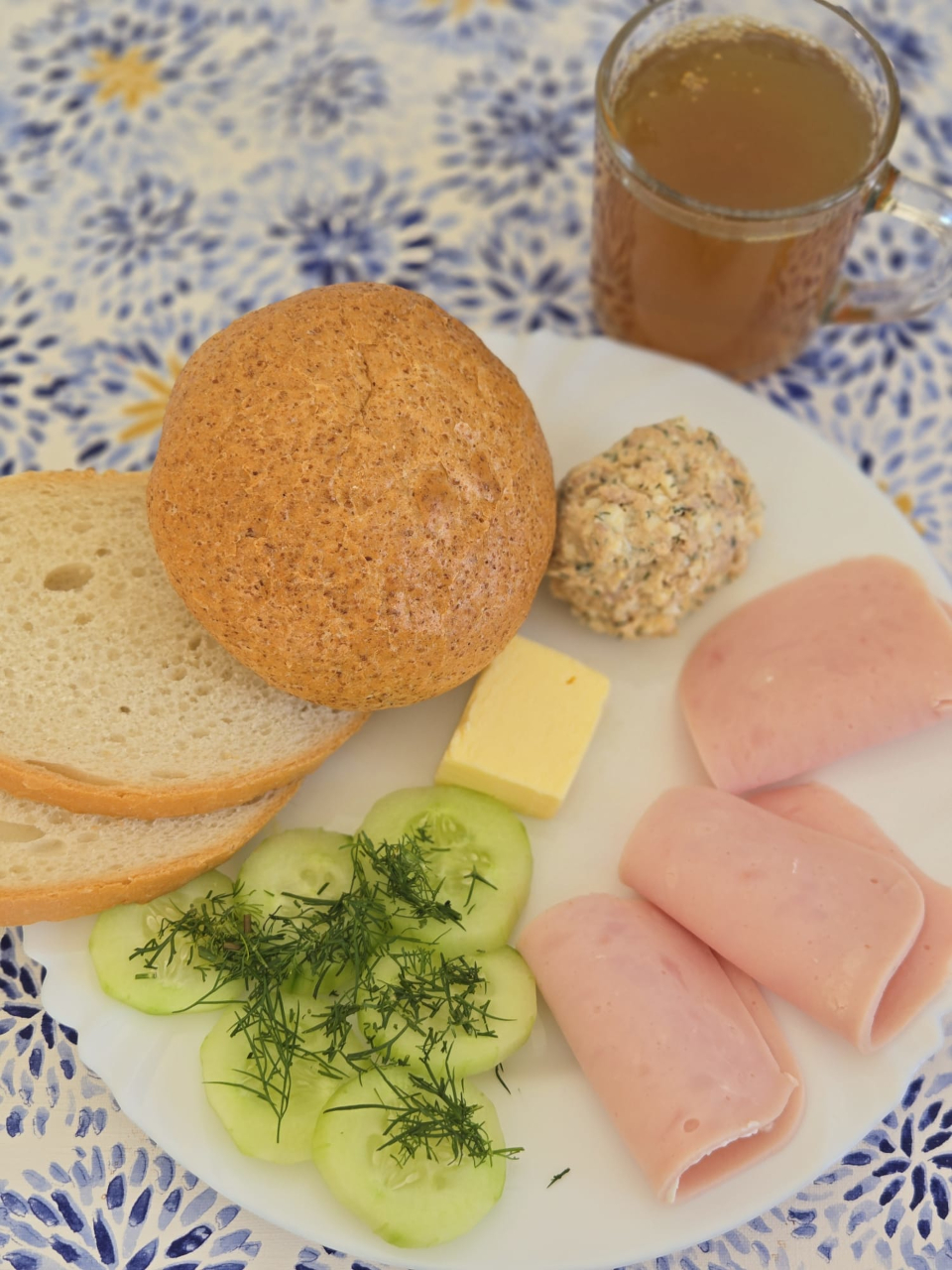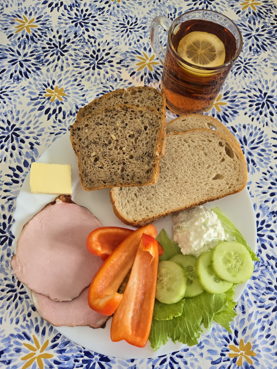 Chleb żytni na zakwasie 40g1 + masło 5g7 + szynka z piersi kurczaka 15g1,6,9 + ogórek kiszony 10g (126kcal) 2- chleb pszenny1, liść sałaty W- z serem żółtym7