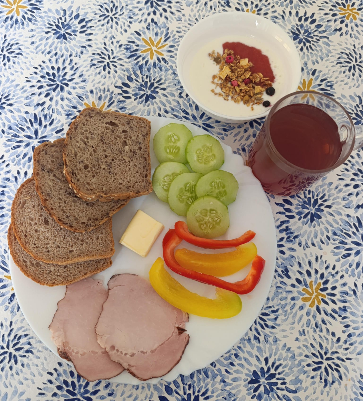 Chleb żytni bez drożdży 40g1+ pasta twarogowa z suszonymi pomidorami 20g7 (198kcal) 2- chleb pszenny1 ML- szynka drobiowa 15g1,6,9 + ogórek