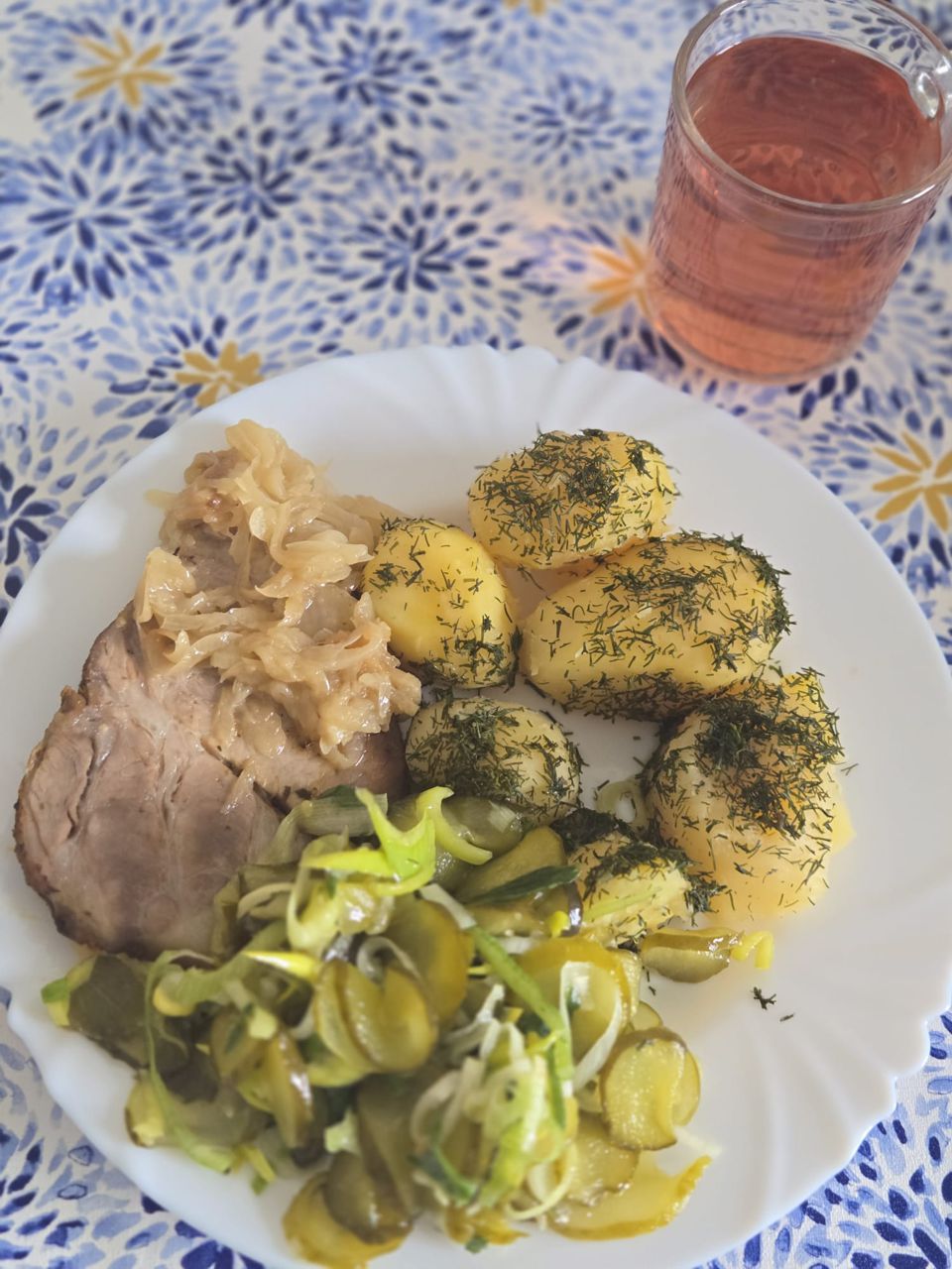 Młode ziemniaki gotowane (200g) (154kcal) ze skwarkami (30g) i maślanką7 (100g) /ML. – jogurt sojowy6/ /2./6. /3. – zamiast skwarek koperek 10g