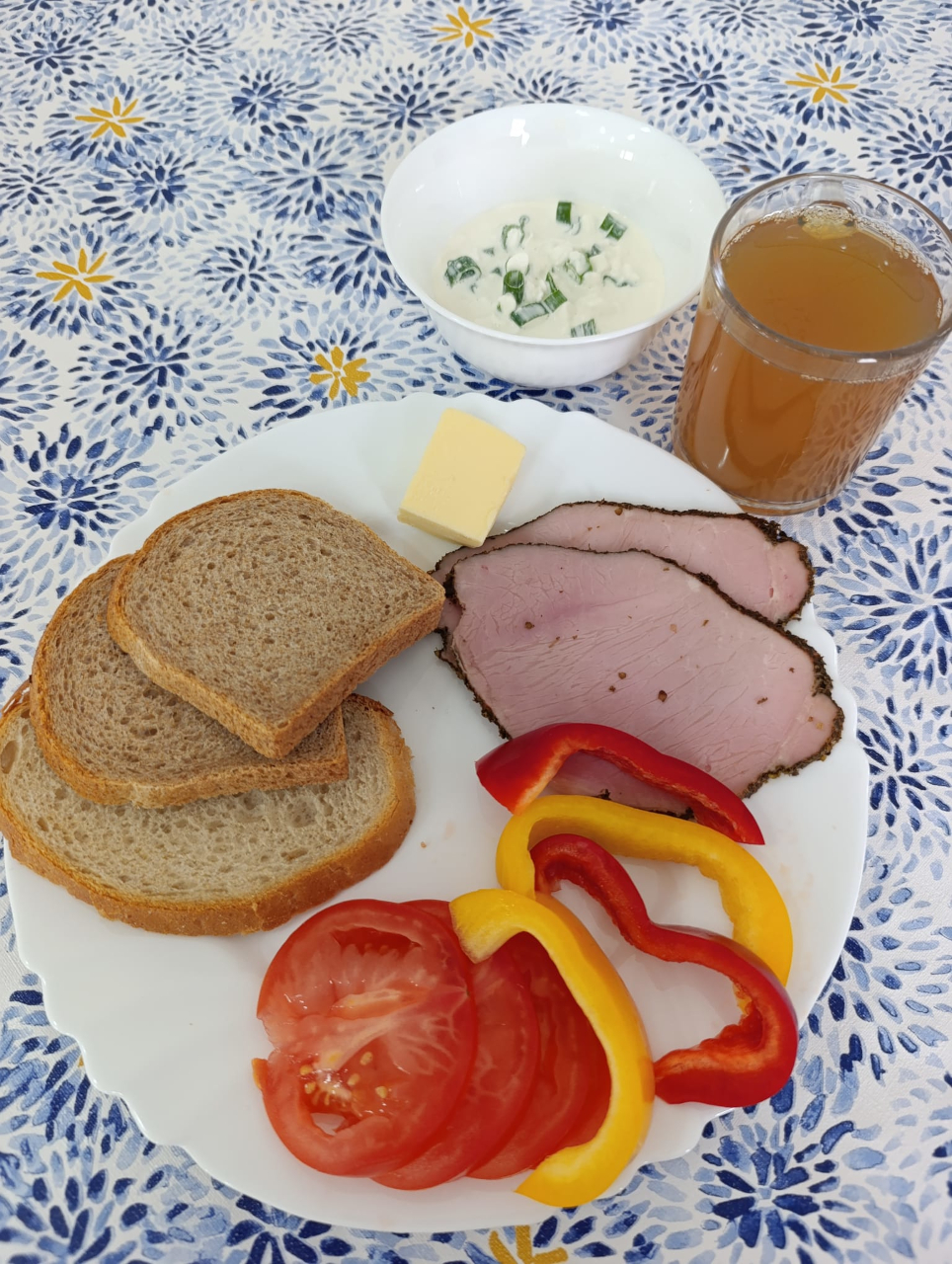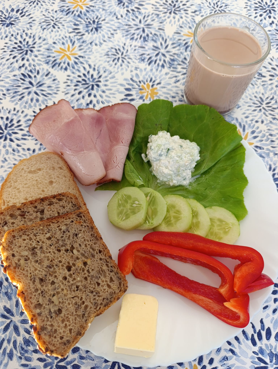 Chleb żytni bez drożdży 40g1+ pasta twarogowa z suszonymi pomidorami 20g7 (198kcal) 2- chleb pszenny1 ML- szynka drobiowa 15g1,6,9 + ogórek