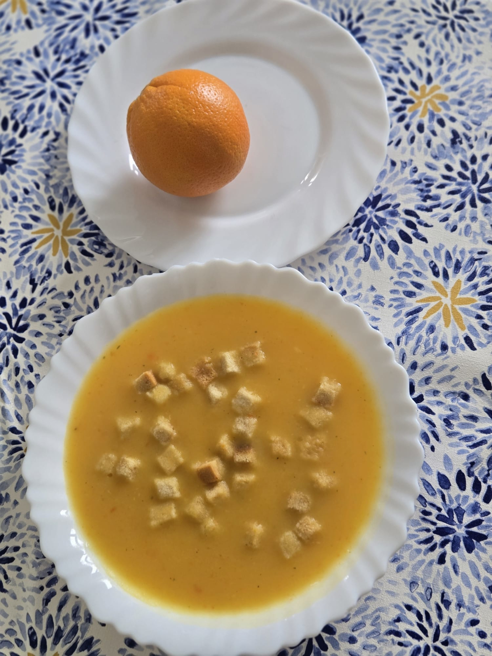 Zupa krem z dyni z grzankami z chleba graham1,7  300ml (161 kcal)/ ML. / 3.– zabielana śmietaną sojową8