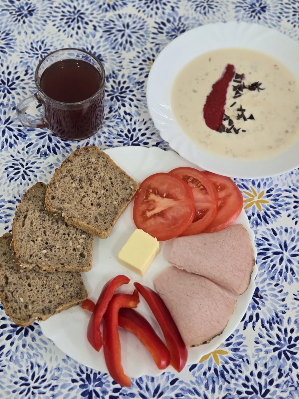 Barszcz biały z ¼ jajka (12,5g)1,3,9 (300 ml)(236 kcal) / ML. – zabielana śmietaną sojową6 /2./3. – Zupa kalafiorowa z ziemniakami i marchewką7 300ml (180kcal)