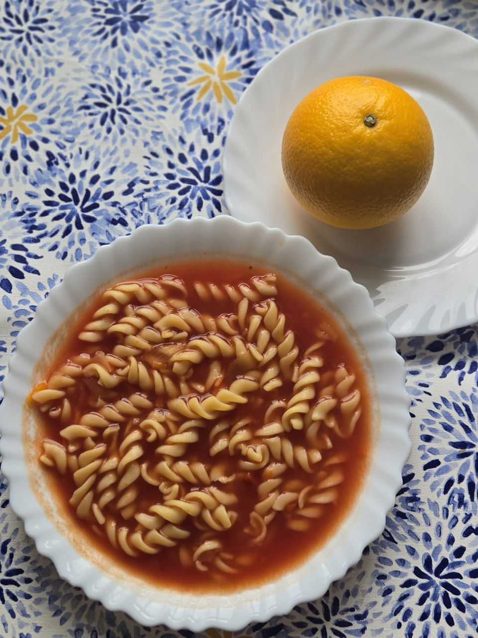 Pomidorowa zupa z makaronem 1,7,9 210ml /90g (180kcal) /ML. / 3./ 6.– z makaronem pełnoziarnistym, zabielana śmietaną sojową8