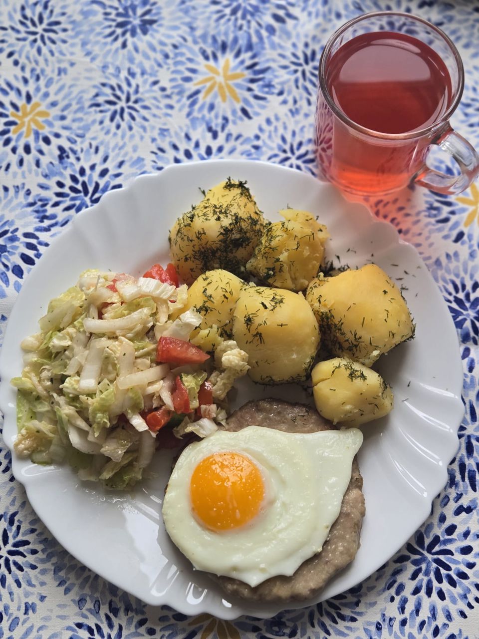 Sznycel wieprzowy z jajkiem sadzonym 3 135g, w tym 100g mięsa i 30g jaja (215kcal)