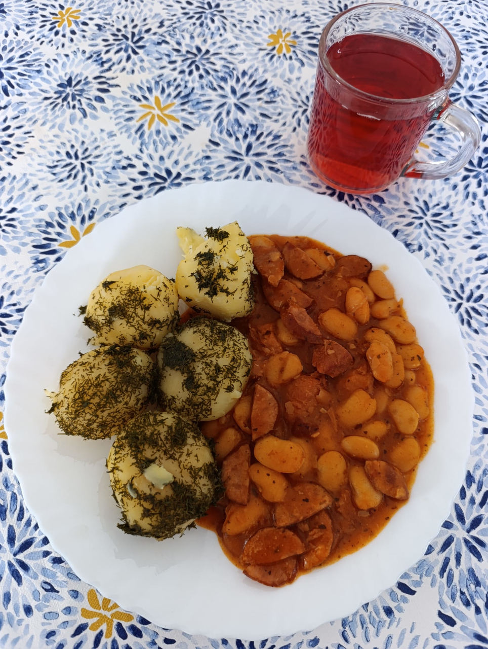 Fasolka po bretońsku (350g)(397 kcal) /2./3. – Pierś z kurczaka w sosie koperkowym7 (w tym 100g mięsa/50g sosu) + Surówka z sałaty z tartą rzodkiewką z sosem winegret (120g)