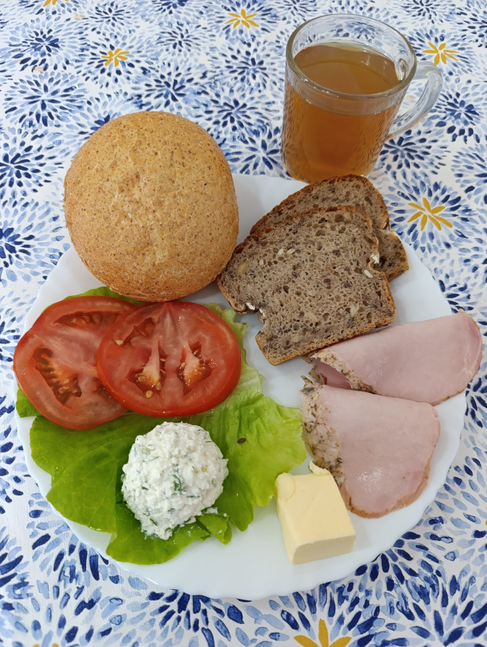 Chleb żytni bez drożdży 40g1+ pasta twarogowa z suszonymi pomidorami 20g7 (198kcal) 2- chleb pszenny1 ML- szynka drobiowa 15g1,6,9 + ogórek