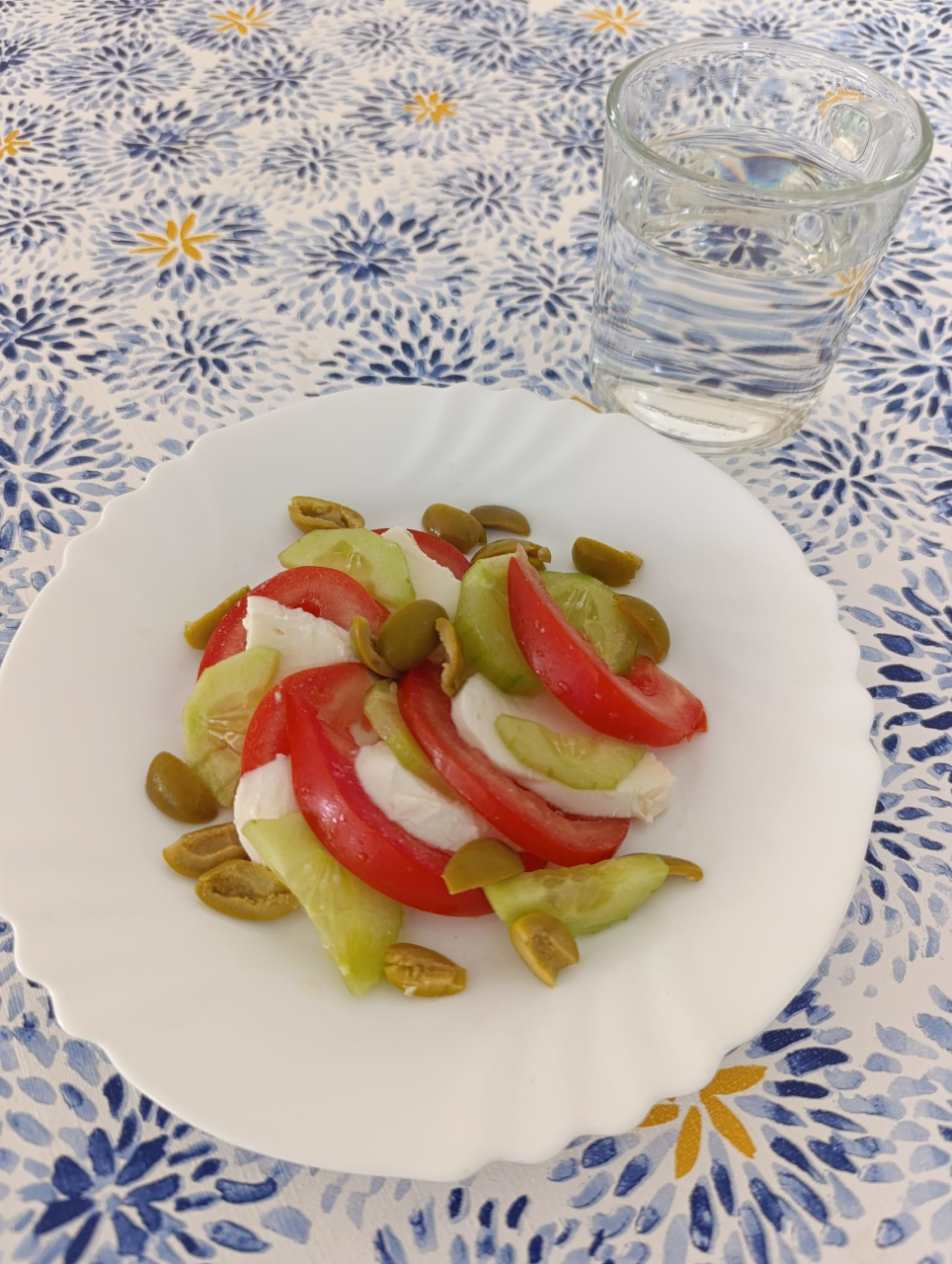 Sałatka z serem feta (pomidor, papryka, ogórek, oliwki, oliwa, sok cytrynowy) 70/30g7 (139kcal) 2- sałatka z mozzarellą (pomidor bez skórki, oliwki, oliwa, sok cytrynowy) 70/307 (138kcal) ML- bez sera, więcej warzyw
