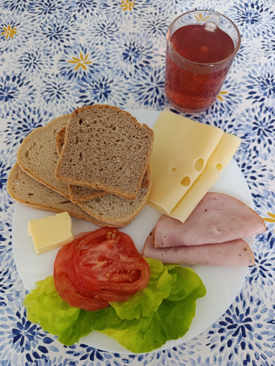 Chleb żytni na zakwasie 40g1 + masło 5g7 + szynka z piersi kurczaka 15g1,6,9 + ogórek kiszony 10g (126kcal) 2- chleb pszenny1, liść sałaty